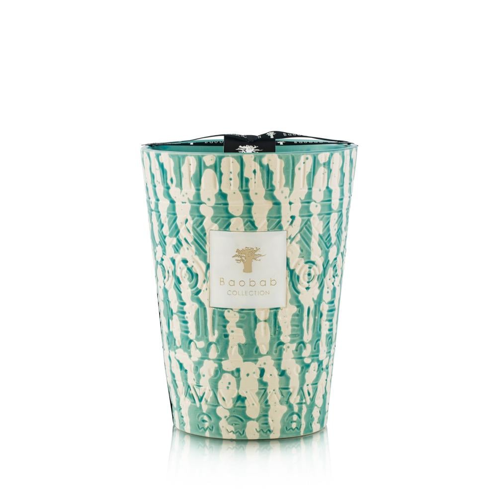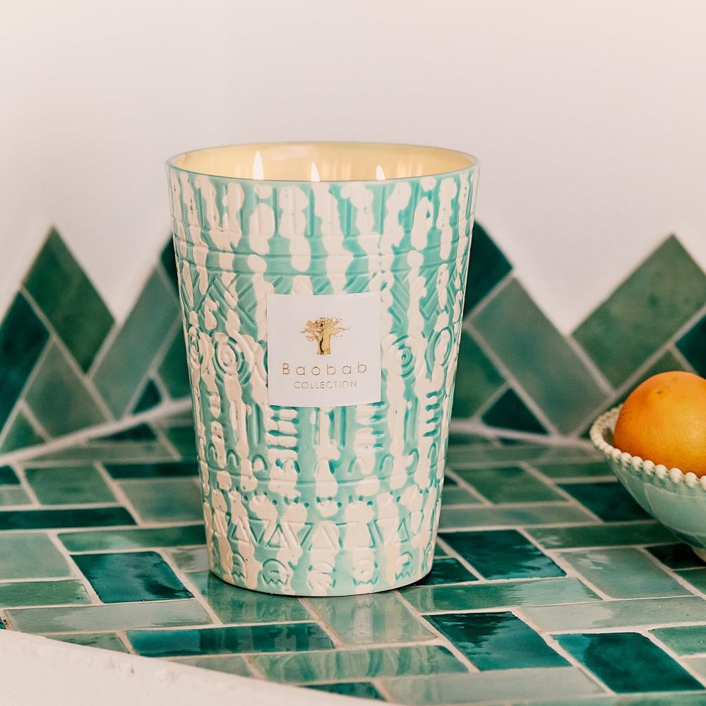 شمعة يوتوبيا المعطرة مصنوعة من السيراميك المصنوع يدويًا والمحفور عليه رموز السكان الأصليين في المادة. يتخلل التزجيج الفيروزي الفاتح غير اللامع خطوط عمودية عشوائية. يوتوبيا هو مجتمع يقع على بعد 250 كم من أليس سبرينغز وتديره النساء بشكل رئيسي. يبرز فنانون ذوو أنماط خاصة جدًا، معروفين بتصميماتهم الباتيكية.