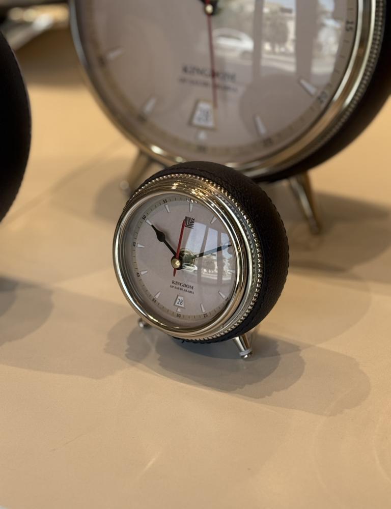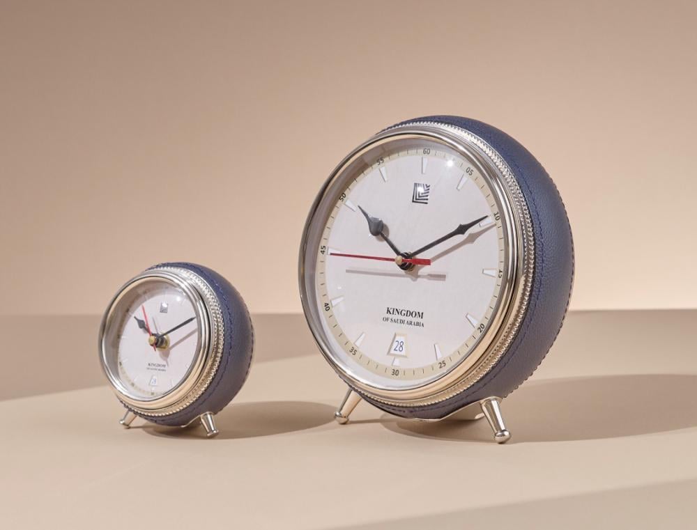 ساعة طاولة بتصميم عصري من النيكل مع إطار جلدي باللون الأزرق، تضفي لمسة من الحداثة والرقي على ديكور المكتب أو غرفة المعيشة.