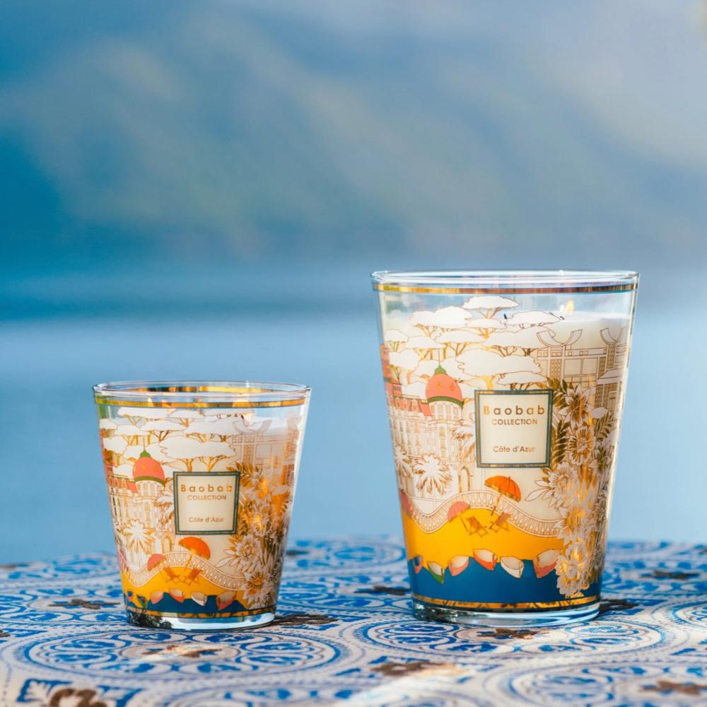 استُلهم ديكور شمعة كوت دازور المطبوع بتقنية الشاشة الحريرية من بعض عناصر تصميم تييري لارشيه، مثل نيغريسكو وشارع بروميناد ديزونغليه الأسطوري. أردنا أن نخطو خطوة أبعد من خلال دمج عناصر معمارية من مدينتي مينتون وسان تروبيه. في المناطق النائية، يمكنك تخيل غابات الصنوبر المظللة، والحلم بزيارة مؤسسة مايغت في أعالي سان بول دو فونس.